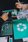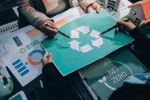Młode azjatyckie zespoły biznesowe omawiają produkt wielokrotnego użytku w biurze, zakładają ekologiczny biznes, ochronę środowiska, zrównoważony model biznesowy, strategię ESG, spotkanie zespołu, ludzie pracują w domu