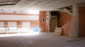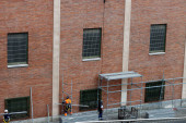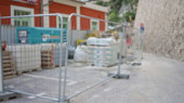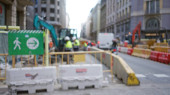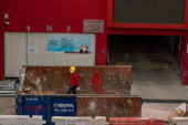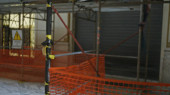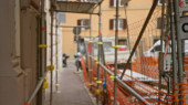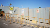 Zamazany widok na plac budowy z nieostrymi barykadami i ogrodzeniem na pierwszym planie, rejestrujący atmosferę przemysłową bez widocznych pracowników.