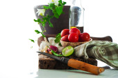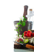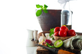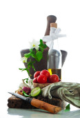 świeże warzywa i oliwy z oliwek na Starym drewnie wyblakły z o