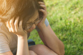 Smutne, młoda kobieta przy stole w parku