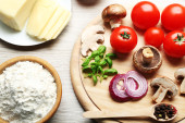 Makaron penne z pomidory, ser, przyprawy i bazylia na rustykalne drewniane tła