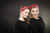 Zdjęcie "dwa szczęśliwe dziewczyny młode czarne tło" może być wykorzystywane do celów osobistych i komercyjnych zgodnie z warunkami zakupionej licencji Royalty-free. Obraz jest dostępny do pobrania w jakości wysokiej rozdzielczości do 5760x3840.