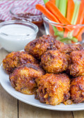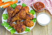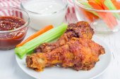 Kurczak pieczony podawany z laski seler i marchew, blue cheese sos i gorącym sosem