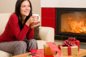 Boże Narodzenie obecny kobieta santa hat domu kominek