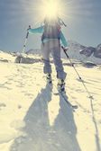 Alpinista, patrząc w dół stoku.