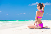 Widok pasuje młodej kobiety w bikini z tyłu. z bliska
