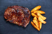 Grillowany stek wołowy z pieczone na Grill wieś ziemniaki, rozmaryn zarządzie stare drewniane. Tło i tekstura