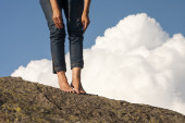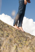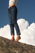 Kobieta nogi, nogi i ręce z dżinsami, na skale, z naturalnego tła i puszysty, białe chmury