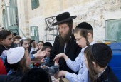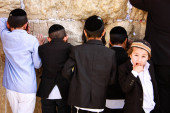 młody lagi ba'omer pielgrzym czytanie tory podczas uroczystości.