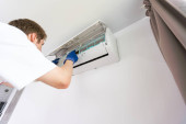 Osoba w rękawiczkach czyści klimatyzator. Prawidłowa konserwacja i czyszczenie zapewniają skuteczne chłodzenie i poprawiają jakość powietrza w pomieszczeniach wewnętrznych. Zasadnicze znaczenie ma regularne utrzymanie.