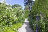 Kamienna droga prowadzi na ławce biały domek kolorowy kwiaty kwitną po obu stronach, w kształcie drzew iglastych, krzewów i wysokie drzewa w ogród angielski w słoneczny letni dzień