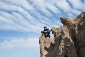 Zdjęcie "Trekker siedzi na szczycie góry z Błękitne jezioro w tle" może być wykorzystywane do celów osobistych i komercyjnych zgodnie z warunkami zakupionej licencji Royalty-free. Obraz jest dostępny do pobrania w jakości wysokiej rozdzielczości do 5760x3840.