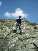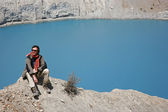 Trekker siedzi na szczycie góry z Błękitne jezioro w tle