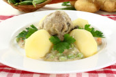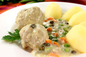 klopsiki w sosie białym z kaparami, ziemniaki i buraki