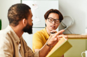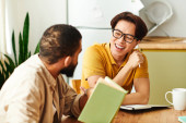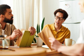 Zdjęcie "Trzech kolegów entuzjastycznie dzieli się pomysłami w jasnej, zachęcającej przestrzeni roboczej." może być wykorzystywane do celów osobistych i komercyjnych zgodnie z warunkami zakupionej licencji Royalty-free. Obraz jest dostępny do pobrania w jakości wysokiej rozdzielczości do 5760x3840.