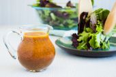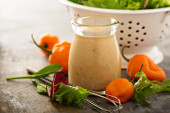 sos sałatkowy w szklanym pojemniku na jasnym tle drewniane