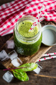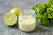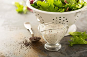 ocet balsamiczny vineaigrette sos sałatkowy w szklanym pojemniku na jasnym tle drewniane