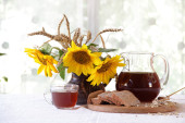 Kwas Chlebowy (kvas) w przejrzysty dzbanek, drewniany kubek i bukiet