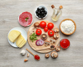składniki do gotowania pizza na drewnianym stole, widok z góry