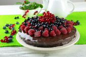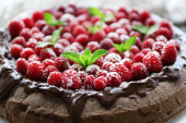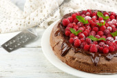 Ciasto z polewą czekoladową i malin na drewniane tła