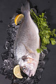 Świeże ryby z cytryną i lodem na metalowej tacy na białym tle