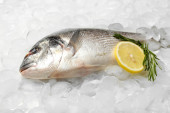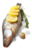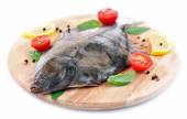 Świeże ryby z cytryną i lodem na metalowej tacy na białym tle