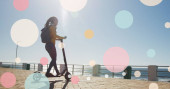 Zdjęcie "Obraz plam świetlnych nad birasową kobietą robiącą zdjęcia z aparatem na promenadzie. koncepcja zdrowia i sprawności generowana cyfrowo." może być wykorzystywane do celów osobistych i komercyjnych zgodnie z warunkami zakupionej licencji Royalty-free. Obraz jest dostępny do pobrania w jakości wysokiej rozdzielczości do 5760x3840.