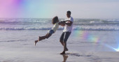 Obraz plam świetlnych nad birasową kobietą robiącą zdjęcia z aparatem na promenadzie. koncepcja zdrowia i sprawności generowana cyfrowo.