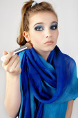 portret pięknej kobiety z pędzle do makijażu w pobliżu atrakcyjna twarz. dziewczyna szminka.
