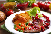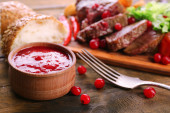 Smaczne mięso pieczone z sosem żurawinowym na talerzu, na jasnym tle