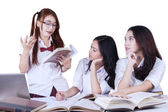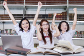Zdjęcie "Udane uczennice podnieść ręce w bibliotece" może być wykorzystywane do celów osobistych i komercyjnych zgodnie z warunkami zakupionej licencji Royalty-free. Obraz jest dostępny do pobrania w jakości wysokiej rozdzielczości do 5760x3840.