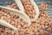 Archiwalne zdjęcie, sterty z kaszą gryczaną z łyżką na powierzchni drewnianych