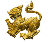 Tajskiej sztuki starożytnej złoty lew singha, na białym tle na czarnym tle z clippingpath
