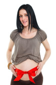 brunetka kobieta w ciąży z czerwoną wstążką na białym tle