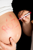 brunetka kobieta w ciąży z czerwoną wstążką na białym tle