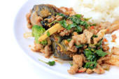 kurczaka lub wieprzowiny z papryki i zioła i przyprawy na ryżu