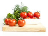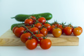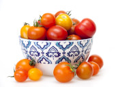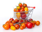 Pomidory czereśniowe różnych klas w koszyku z hipermarketu