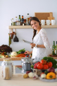 Młoda kobieta używa tabletu do gotowania w kuchni
