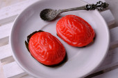 ang ku kueh lub chiński czerwony żółw ciasto jest tradycyjnie spożywane barwione jaja czerwony i mandarynki z okazji pierwszego miesiąca urodzenia dziecka