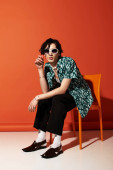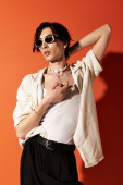 Stylowy młody mężczyzna z ufnością pozuje w letnim stroju na śmiałym pomarańczowym tle.