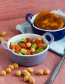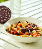Warzywa na parze w misce na drewnianym stole