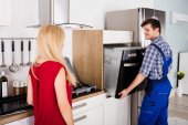 Kobieta, patrząc na pracownika naprawy indukcyjnej