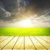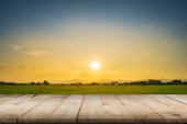 streszczenie pola niewyraźne i światło słoneczne z stół z drewna