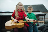 dzieci uczą się gry na gitarze
