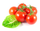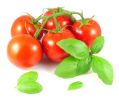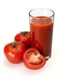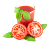 Pozostawia szklankę soku pomidorowego z pomidorami i bazylią