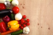 Kompozycja z drewnianym stole różnorodnych surowców organicznych warzyw