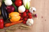 Kompozycja z drewnianym stole różnorodnych surowców organicznych warzyw