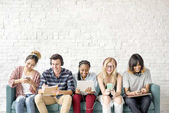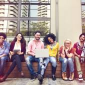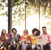 szczęśliwy przyjaciółmi siedząc na ławce z laptopa
