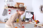 Portret uśmiechniętej kobiety z telefonem w kuchni w domu