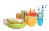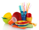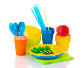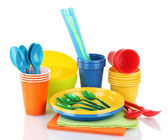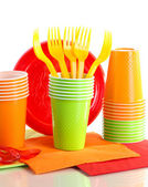 jasne, plastikowe naczynia i serwetki na białym tle
